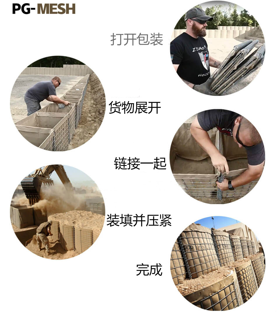 结构特点:防爆墙是一种现代化的军用石笼网用来防洪防爆,它由连接在一起的箱子以及无纺布组成。它可以单独的使用一个格子,也可以连接在一起使用。目前军用防爆墙在中东地区是最受欢迎的,在维和部队营地就是用防爆墙进行安装用来防御危害。起到防护作用。
