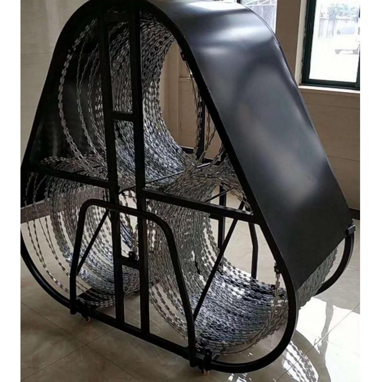 防暴阻隔网采用全钢架结构,钢架整体使用焊接连接牢固可靠。产品由动支架、定支架、刀片网、回收装置等部件组成。